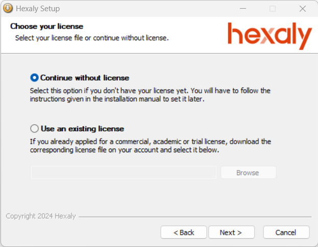 Select your license file or continue without license.¶